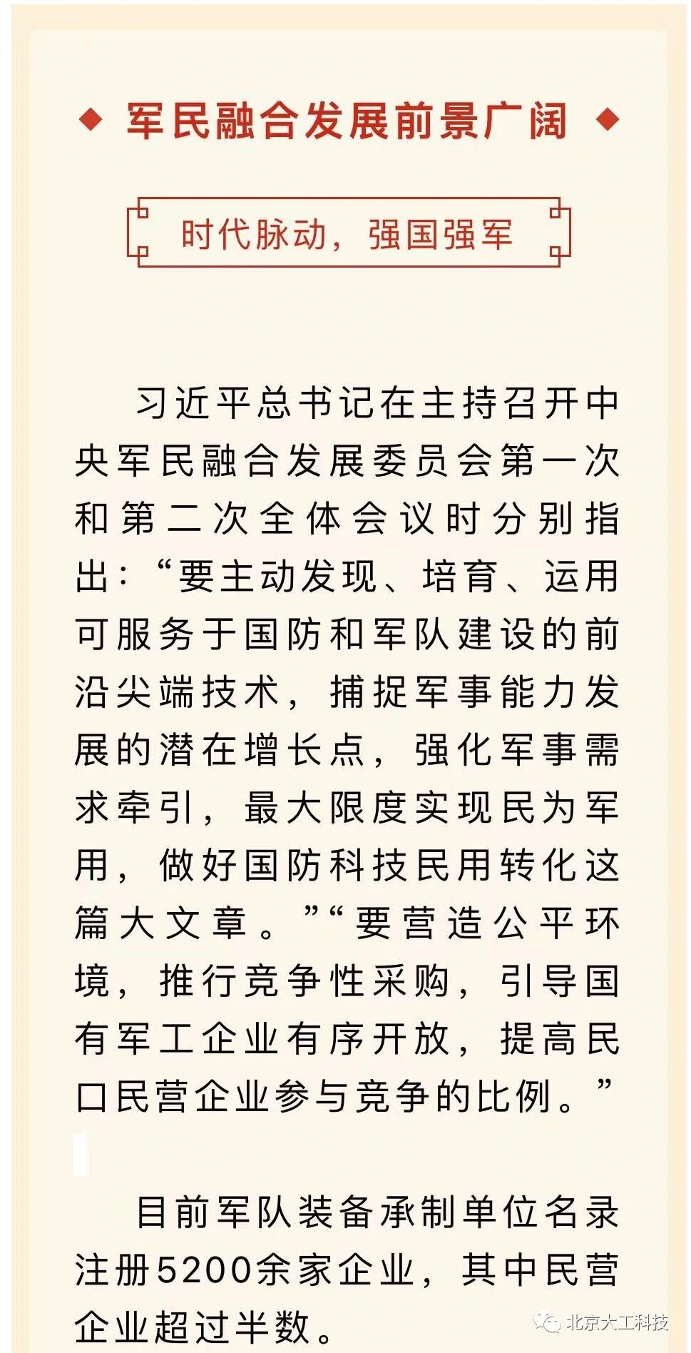 习总书记指出:“国防科技和武器装备领域是军民融合发展的重点,也是衡量军民融合深度发展的重要标志”。